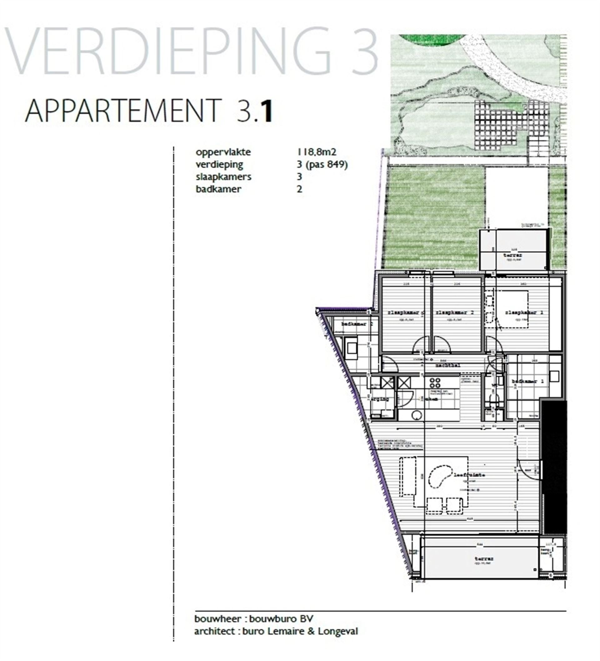 Dit appartement op de derde verdieping omvat een leefruimte met eethoek en open ingerichte keuken, een proviandberging/wasplaats, een nachthal die uitgeeft op de drie slaapkamers, twee badkamers en het aparte toilet. Een absolute troef zijn het overdekte terras vooraan (met 2 bergruimten) én het terras achteraan. Het appartement kan volledig naar eigen smaak en budget worden afgewerkt, met keuze tussen meerdere types keuken- en badkamermeubels. Er kunnen optioneel autostaanplaatsen in de ondergrondse garageverdieping aangekocht worden.