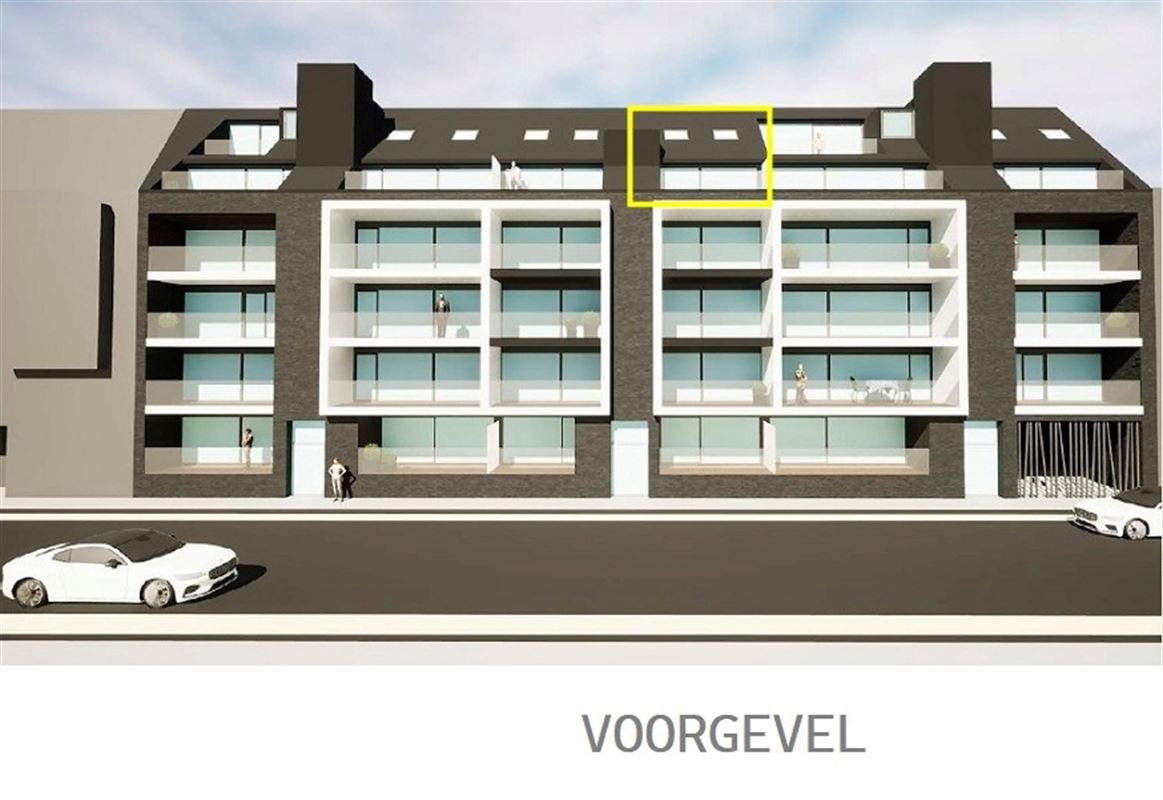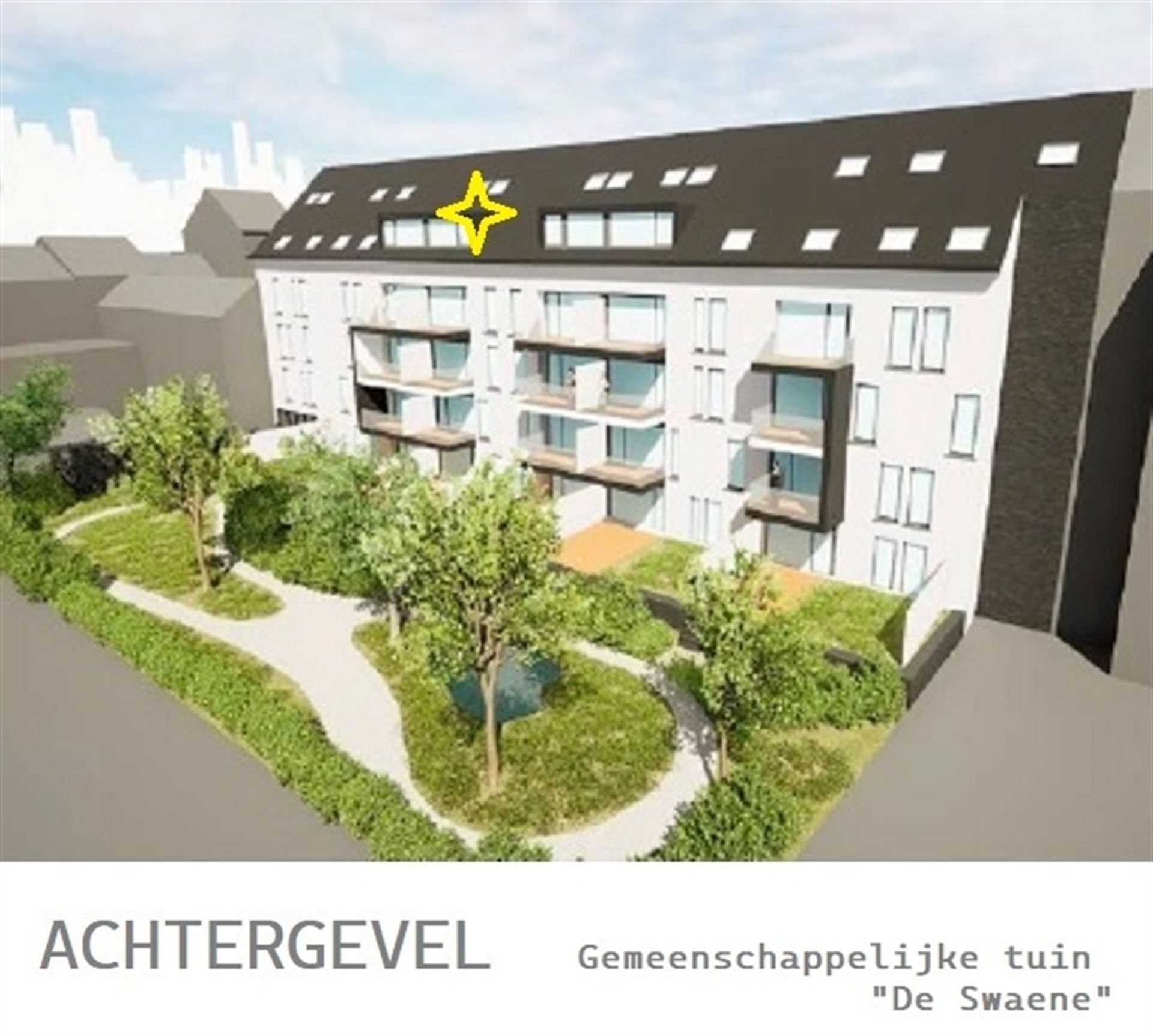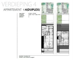 Dit duplex-appartement op de vierde en vijfde verdieping omvat een leefruimte, een sas, een ingerichte keuken, een WC, een nachthal, een badkamer, een slaapkamer 1; een nachthal, een slaapkamer 2, een slaapkamer 3, een badkamer en een berging. Aan de straatkant is een terras met terrasberging. Het appartement kan volledig naar eigen smaak en budget worden afgewerkt, met keuze tussen meerdere types keuken- en badkamermeubels. Er kunnen optioneel autostaanplaatsen in de ondergrondse garageverdieping aangekocht worden.